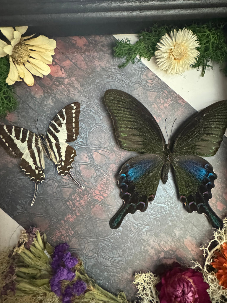 Decorate your space with this gorgeous open framed butterfly garden. Features real butterflies, real dried flowers and preserved moss.