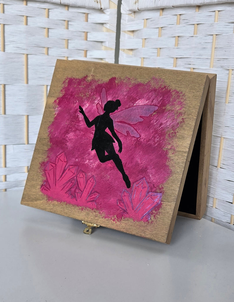Hand painted fairy with crystals on wooden box. Box has a black felt lining.