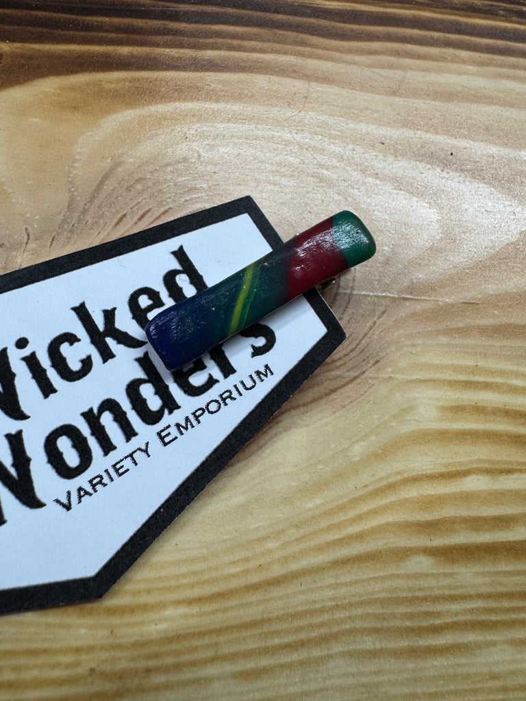 Handmade hair accessories made of polymer clay and coated in resin on alligator clips. Pattern/design may vary from picture.