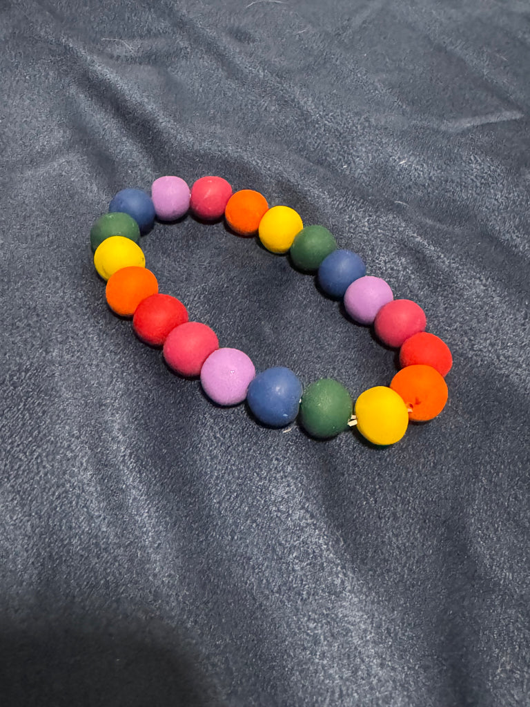 Accessorize with this cute rainbow bead bracelet on a stretchy band.